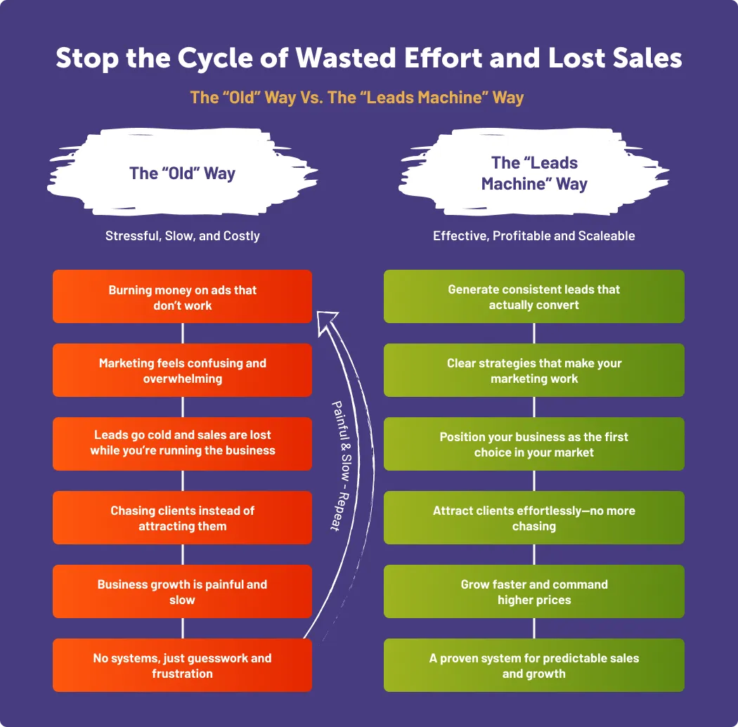Leads Machine was designed for business owners like you—those who are ready to fix their sales process, eliminate the guesswork, and finally create a predictable flow of clients and revenue.